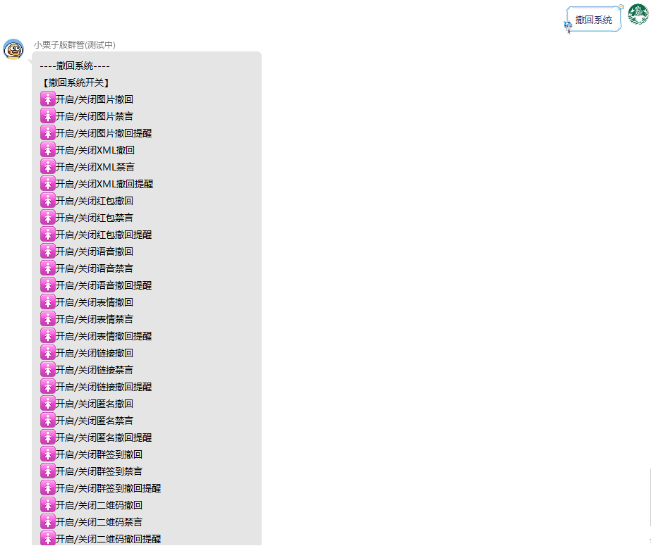 插件功能:买家秀、问答系统、黑白系统、踢人禁言、广告检测、入群审核、刷屏检测、撤回系统、护主系统、匿名系统、提示系统、名片系统、问题反馈、出租系统、远程系统、针对系统、发言排行、邀请统计、邮箱系统、特色系统、召唤系统、开关系统、娱乐系统、资料设置、定时任务、主人专属、群主专属、运行状态、站长工具、私聊指令、警告系统、基础群管、清屏系统、卡密系统、闪照系统 、头衔管理、防撤回系统
